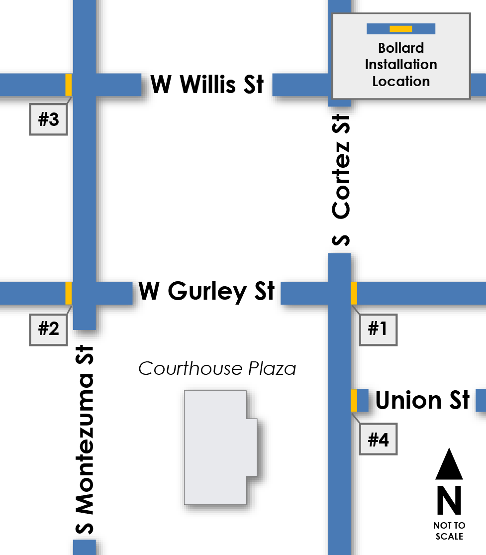 The City of Prescott and their contractor, Combs Construction Company, will resume installing removable bollards in the downtown area at select intersections (shown on the map). Installation in Locations 1, 2 and 4 are complete. Bollard installation in Location 3 (Willis/Montezuma) will begin on Monday, April 28 and is expected to last three weeks. The updated schedule is shown below.